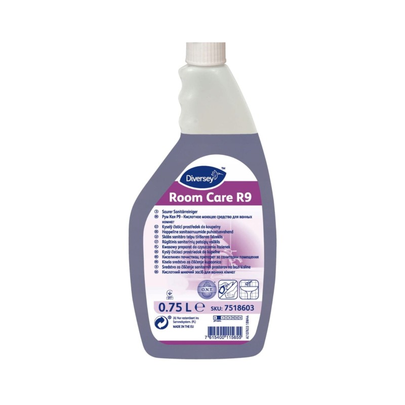 Wybierz Diversey Room Care R9 750 ml 7518603 – skuteczny preparat do profesjonalnego czyszczenia łazienek i sanitariatów, zapewniający higienę i lśniące powierzchnie.