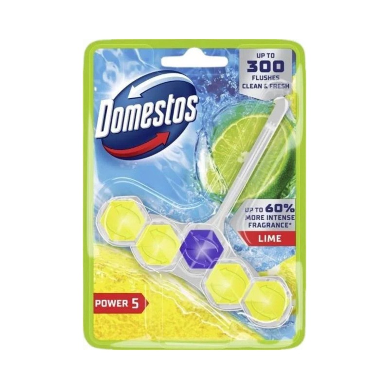 Domestos Power 5 Lime to kostka toaletowa o potężnej mocy czyszczenia i świeżym, limonkowym zapachu. Skutecznie odświeża i utrzymuje higieniczną czystość muszli klozetowej przy każdym spłukaniu.