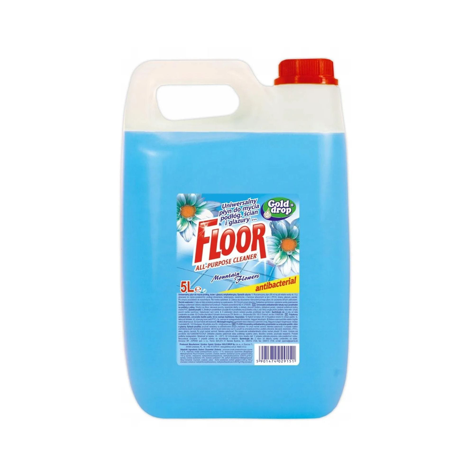 FLOOR uniwersalny to skuteczny płyn do mycia powierzchni o pojemności 5 L, o świeżym zapachu kwiatów górskich w wersji niebieskiej. Produkt doskonale usuwa zabrudzenia, nie pozostawia smug i zapewnia przyjemną świeżość w pomieszczeniach.