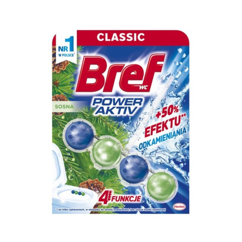 Zawieszki toaletowe BREF Power Aktiv Pine z efektem odświeżacza powietrza to łatwy i wygodny sposób na zapewnienie czystości i świeżości w toalecie od pierwszego aż do ostatniego spłukania. Innowacyjna formuła Bref Power Aktiv spełnia 4 funkcje, które zawarte są w dyskretnym i nowoczesnym opakowaniu. Nowa generacja kostek do toalet hamuje osadzanie się kamienia i pomaga utrzymać toaletę czystą i świeżą poprzez połączenie ochrony przed zabrudzeniami i extra świeżości.