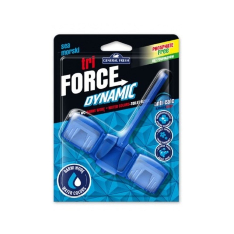 Kostka WC GF TRI FORCE Dynamic to innowacyjny produkt, który zapewnia kompleksowe czyszczenie i świeżość Twojej toalety. Specjalnie dobrane składniki myją muszlę klozetową oraz zapobiegają osadzaniu się kamienia. Barwiąca formuła sprawia, że woda zabarwia się na niebiesko, a pieniąca się woda długo utrzymuje świeżość i pozostawia przyjemny morski zapach.