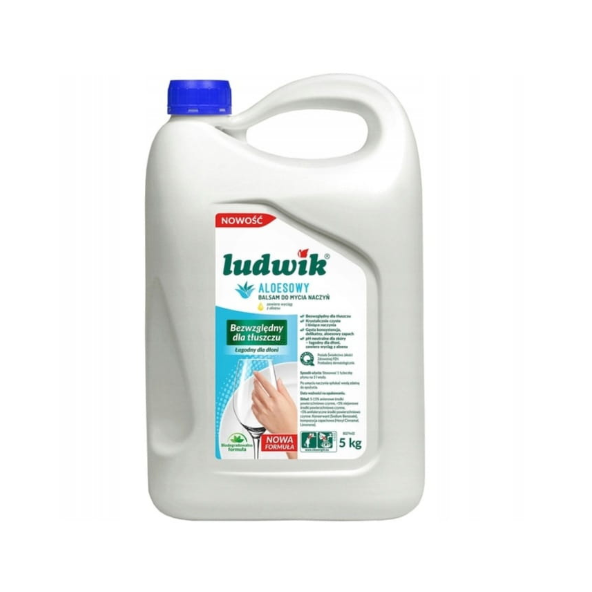 Ludwik płyn do naczyń Balsam Aloes 5L to wszechstronny i skuteczny środek czyszczący, idealny do użytku domowego i komercyjnego, zapewniający czystość, połysk oraz ochronę skóry i środowiska.