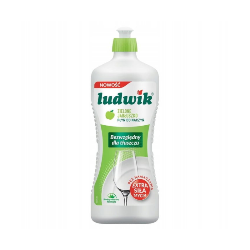 Ludwik Płyn do naczyń Zielone Jabłuszko, 900 ml, jest idealnym rozwiązaniem do skutecznego usuwania tłuszczu oraz zaschniętych resztek jedzenia z talerzy, szklanek, sztućców i garnków. Dodatkowo neutralizuje nieprzyjemne zapachy, pozostawiając świeży aromat zielonego jabłuszka.