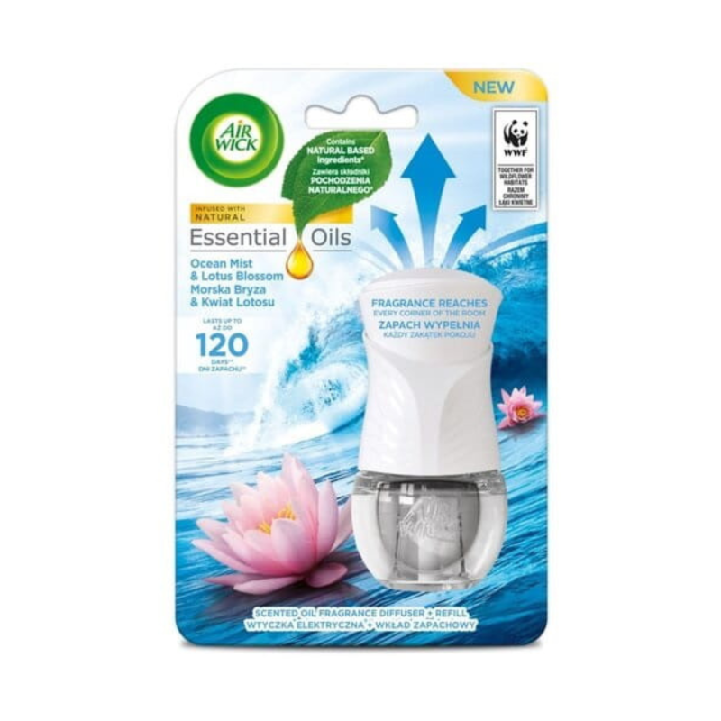 AIR WICK elektryczny komplet Morska Bryza i Kwiat Lotosu to doskonałe rozwiązanie dla każdego, kto pragnie wprowadzić do swojego domu odrobinę świeżości i spokoju. Dzięki wyjątkowemu połączeniu zapachu morskiej bryzy i kwiatu lotosu, ten odświeżacz skutecznie neutralizuje nieprzyjemne zapachy i zapewnia długotrwałą świeżość nawet do 120 dni*.
