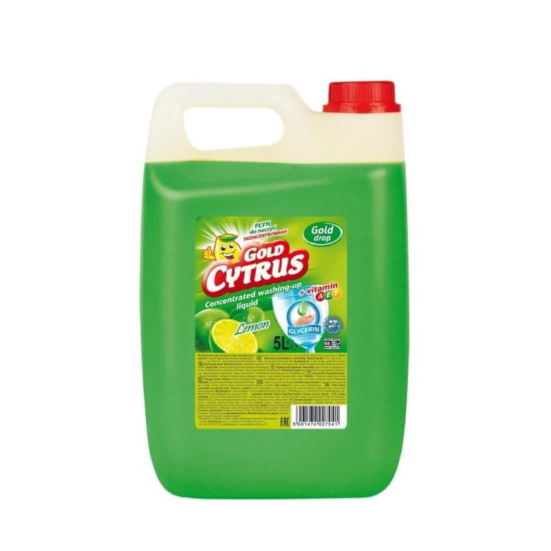 Gold Drop Gold Cytrus to płyn do mycia naczyń o pojemności 5 litrów, który skutecznie usuwa zabrudzenia z różnych rodzajów naczyń, takich jak tworzywa sztuczne, szkło i metal. Jego cytrynowy zapach zapewnia przyjemne doznania podczas mycia naczyń.
